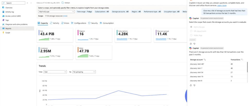 Por si no lo sabías, el 6 de agosto de 2025, Microsoft anunció en su blog oficial el lanzamiento en vista previa de Azure Storage Discovery, un servicio totalmente gestionado que permite obtener una visión integral de todo el ecosistema de Azure Blob Storage. Gracias a su integración con Azure Copilot, ahora es posible consultar y analizar datos en lenguaje natural, sin necesidad de desarrollar scripts ni desplegar infraestructura adicional.